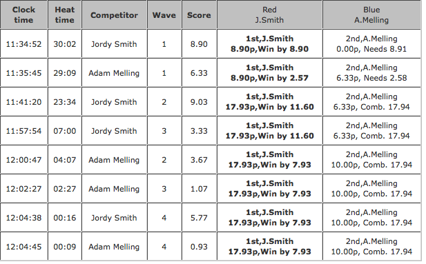 QF 4: Adam Melling (AUS) 16.43 def. Damien Hobgood (USA) 5.67